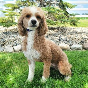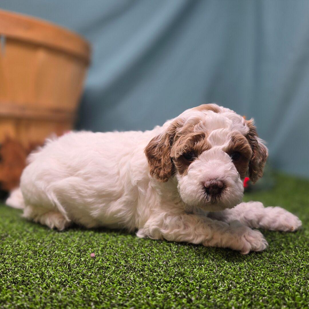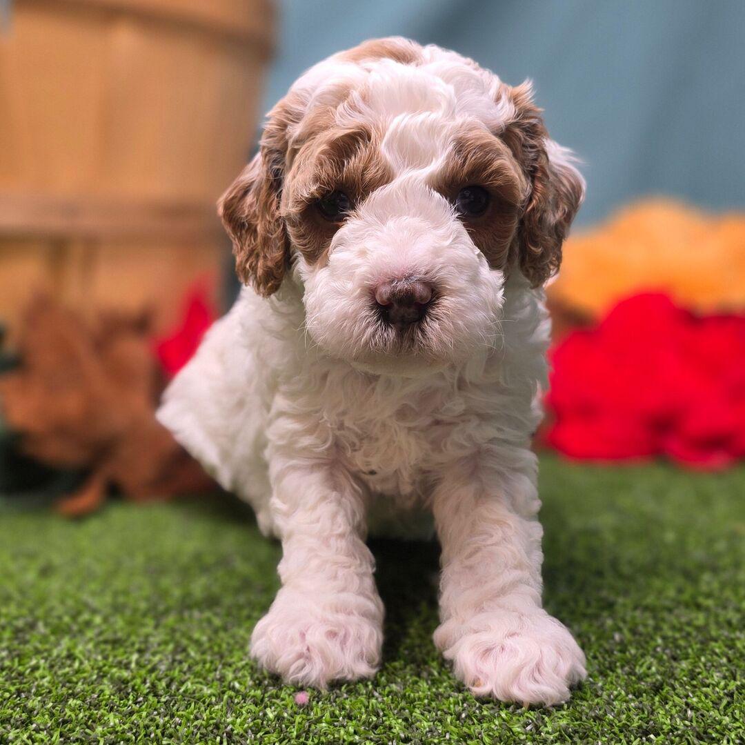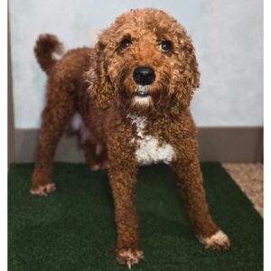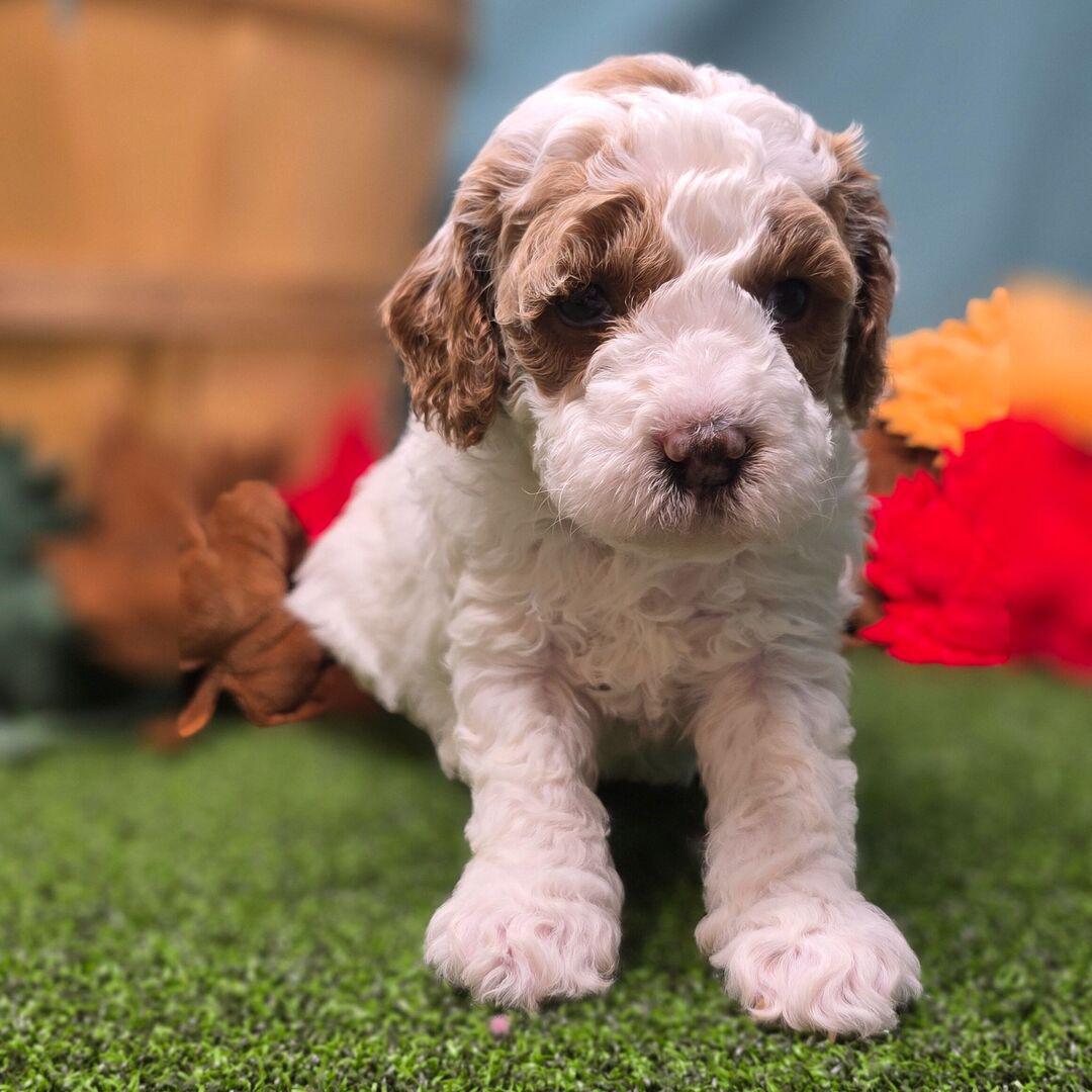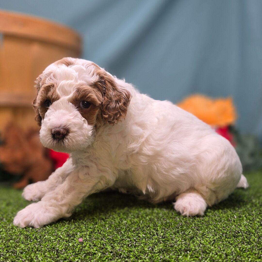 Goldendoodle. My dad is a Poodle and my mom is a Goldendoodle. I have a beautiful red & white coat, and I was born on October 22, which makes me a Libra sign. I’ll be ready to go home to my forever family after December 22, once I’m grown enough to leave my litter. I’m ICA registered. I will bring love, laughter, and a bit of puppy mischief.
