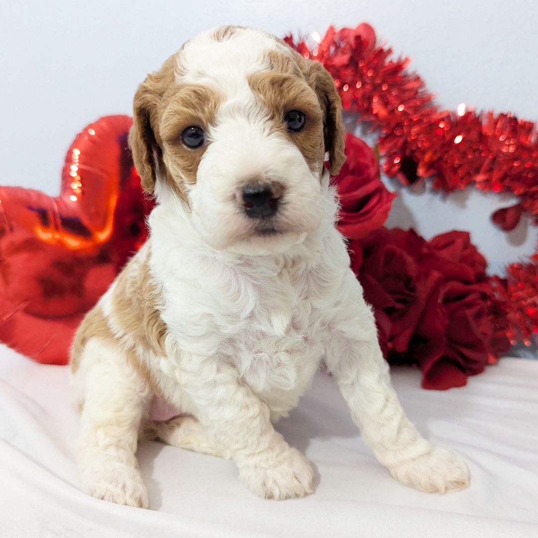Hi, I’m Gigi! I’m a 4-week-old female Poodle with a beautiful red & white coat, born on December 20, which makes me ready to