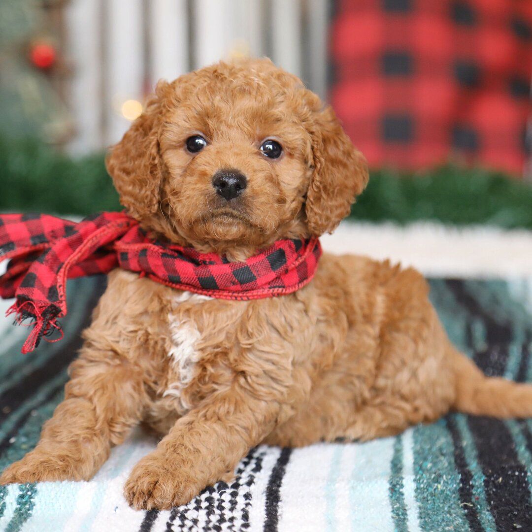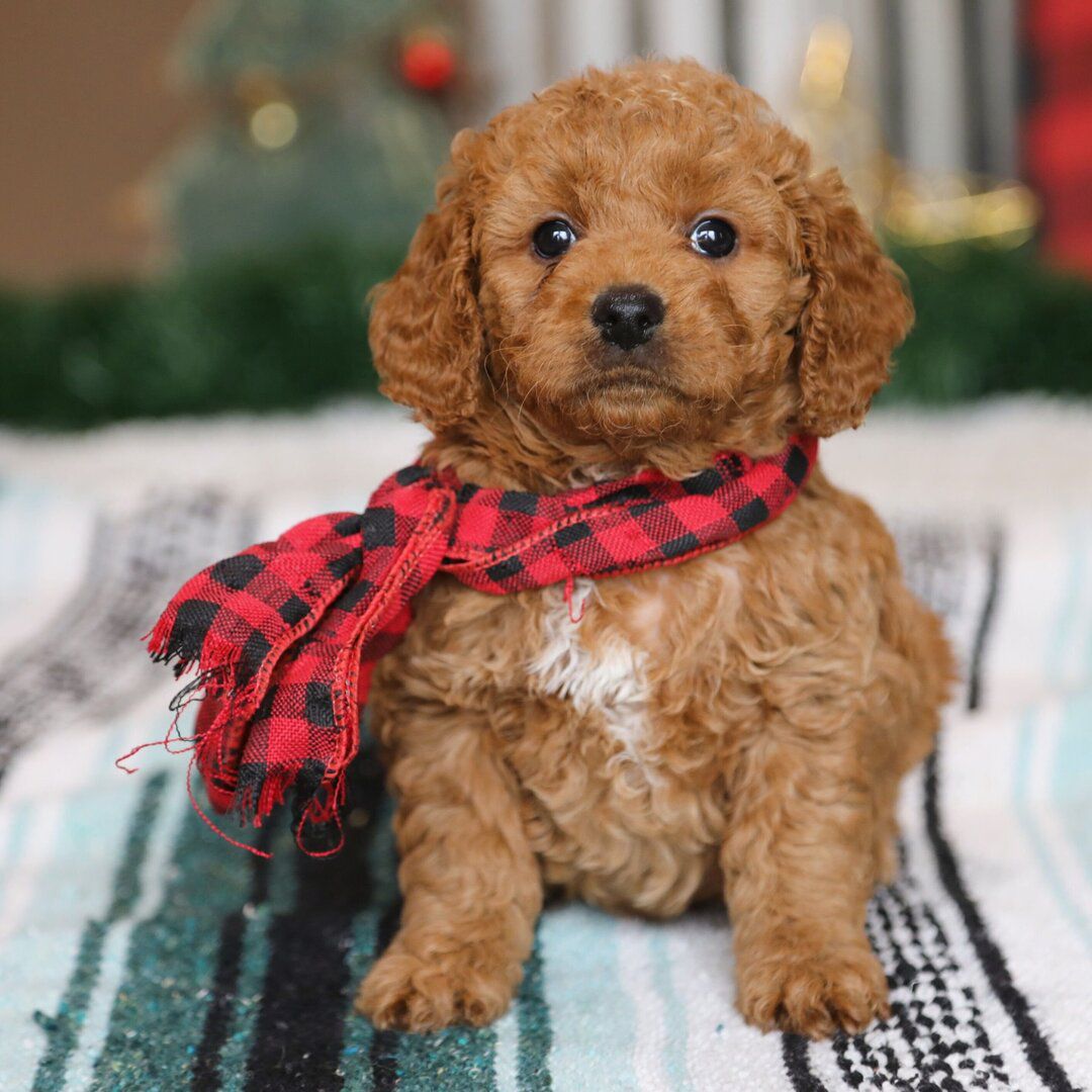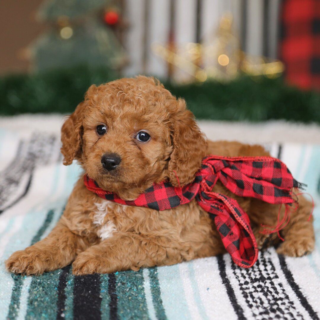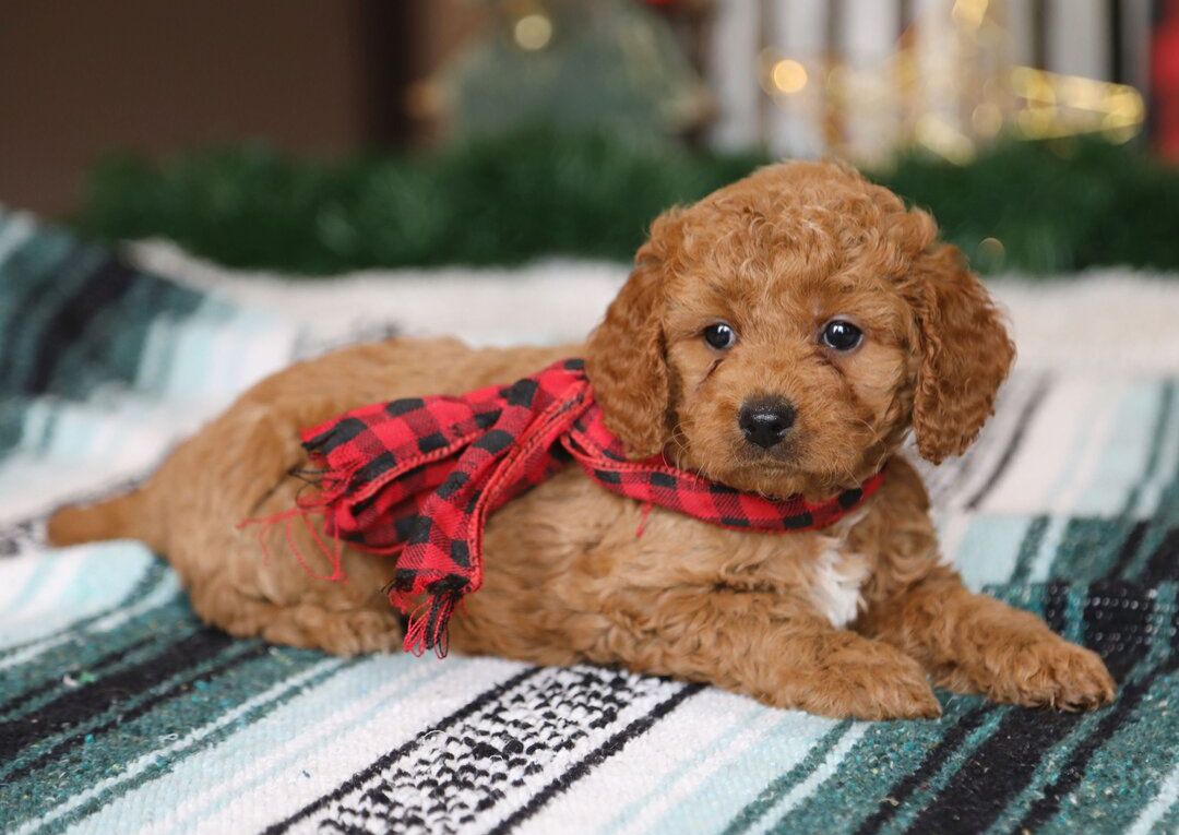 Hi, I’m Swiss Miss! I’m a 6-week-old female Goldendoodle. My dad is a Poodle and my mom is a Goldendoodle. I have a beautiful red coat, and I was born on October 13, which makes me a Libra sign. I’ll be ready to go home to my forever family after December 8, once I’m grown enough to leave my litter. Some might even say l’m a tennis ball connoisseur! I like anything that gets my tail wagging. I can play for hours, then curl up for a good ‘ol nap.