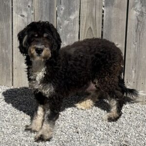 Bernedoodle. My dad is a Poodle and my mom is a Bernedoodle. I have a beautiful black, tan & white coat, and I was born on August 28, which makes me a Virgo pup. I am ready now to plan my trip to my forever family. I’m CKC registered. I’m ready to be your little ball of love and joy.